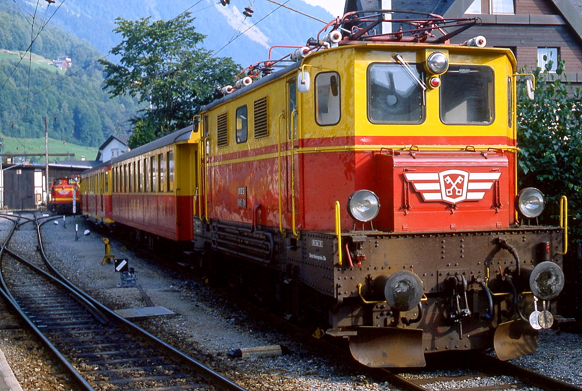 Mit einem Güterwagen verläßt der ET 10.106 (ex-ÖBB 4060.02) im August 1982 den Bahnhof Tschagguns in Richtung Schruns