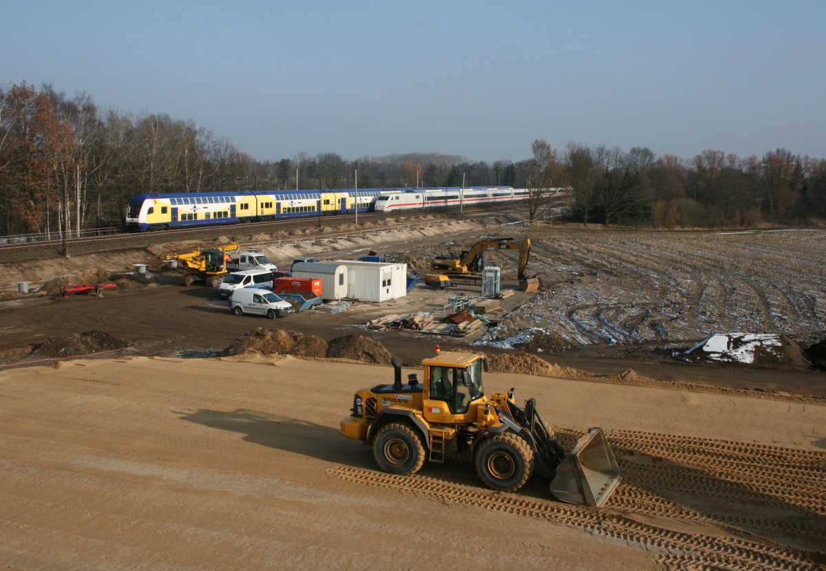 ME 82122 (Uelzen–Hamburg Hbf) und ICE 79 (Hamburg-Altona–Zürich HB) passieren am 14.02.2013 die Baustelle zur Neuerrichtung einer Straßenbrücke zwischen Winsen (Luhe) und Ashausen.