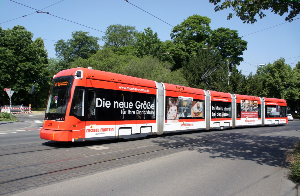 Straßenbahn Mainz: Stadler Rail Variobahn der MVG Mainz - Wagen 222, aufgenommen im Juni 2015 in der Nähe der Haltestelle "Am Gautor" in Mainz.