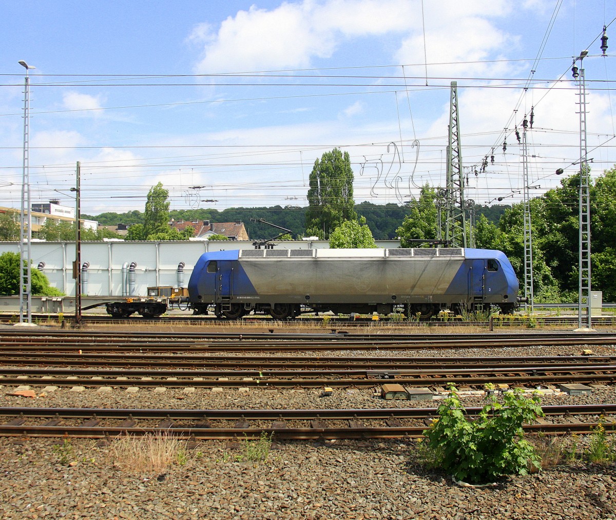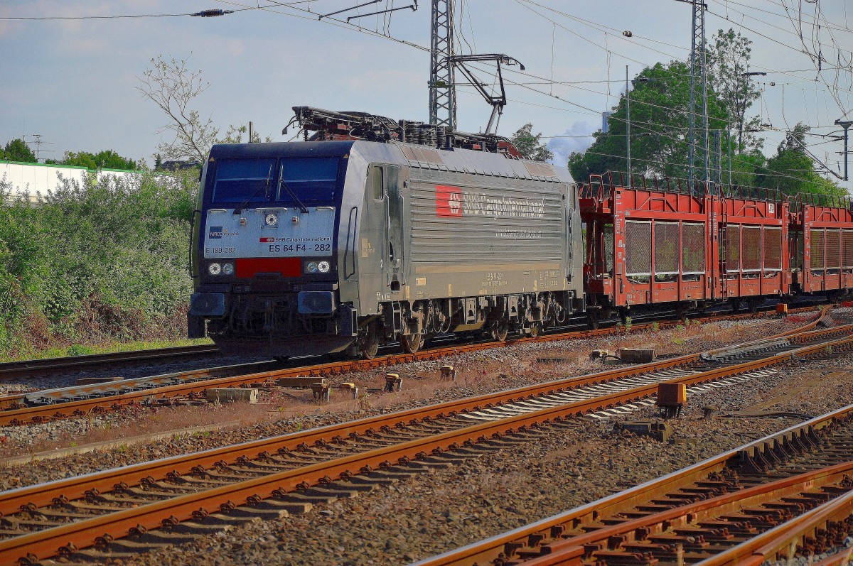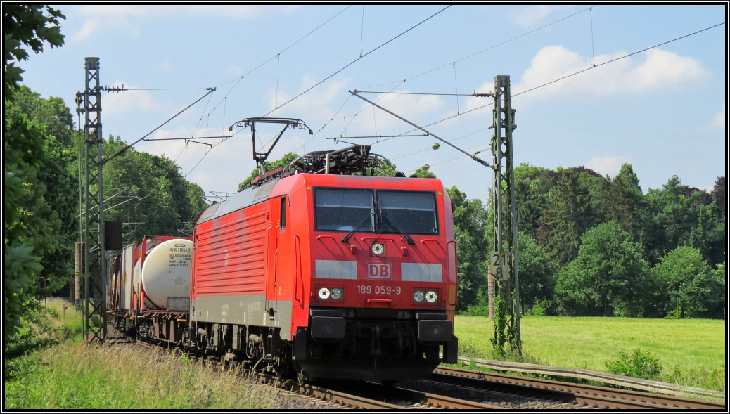 Mittagsruhe in Rimburg! Denkste! Mit lauten Getöse macht die 189 059-9 schon von Weitem auf sich aufmerksam. Mit einen Aufliegerzug am Haken geht es in Fahrtrichtung Übach Palenberg. Szenario von der Kbs 485 am 10.Juni 2015.