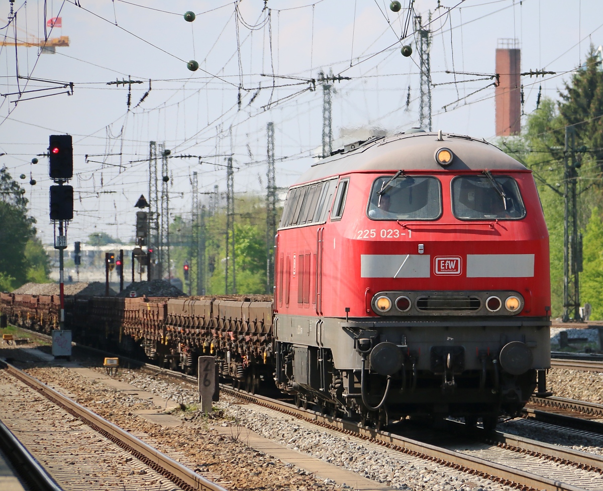 225 023-1 der EfW donnert mit einem Alt-Schotter-Zug durch den Heimeranplatz. Aufgenommen am 25.04.2014.