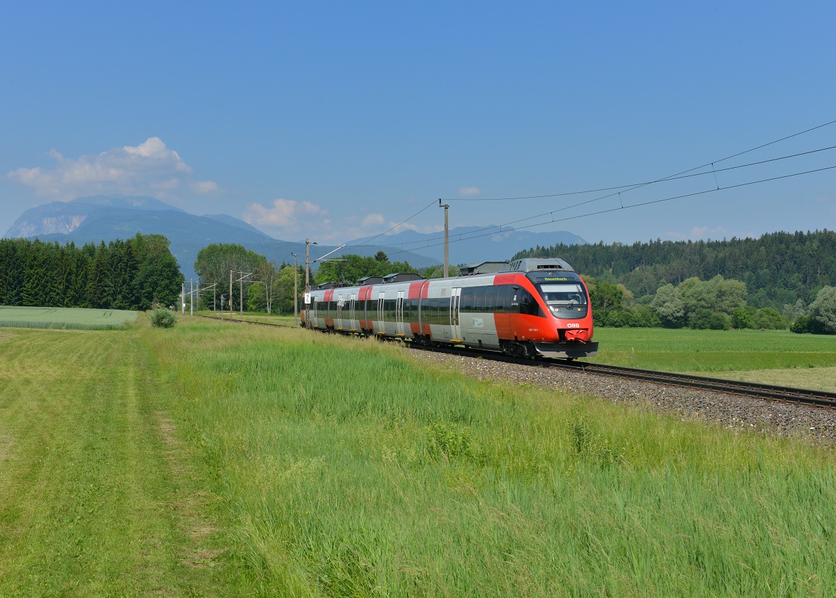 1144 XXX mit D 736 (Lienz - Villach Hbf) am 13.6.2015 zwischen Greifenburg-Weißensee und Steinfeld im Drautal .