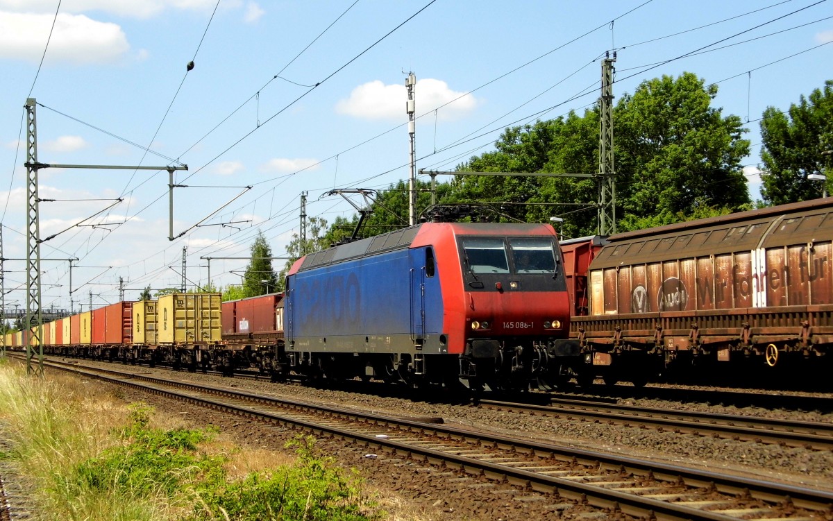 145 019-6 fährt am 10.06.2015 mit dem GA 52804 (Mosel - Braunschweig Rbf) durch den Haltepunkt Zwickau-Pölbitz.