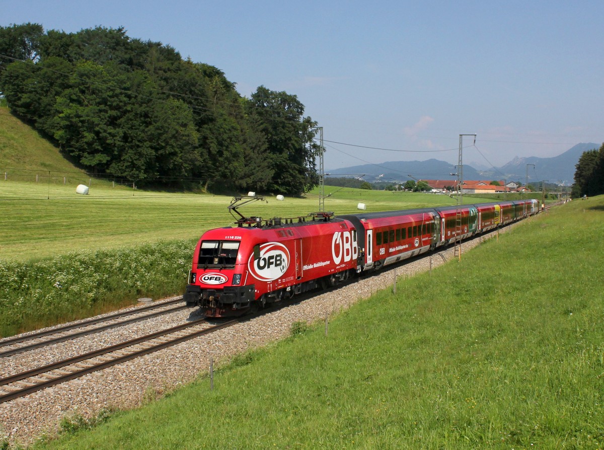1116 236-1 schiebt am 11.6.2015 den railjet 632 in Richtung Wien Hbf. Hier zu sehen beim Halt im Bahnhof Greifenburg-Weißensee.