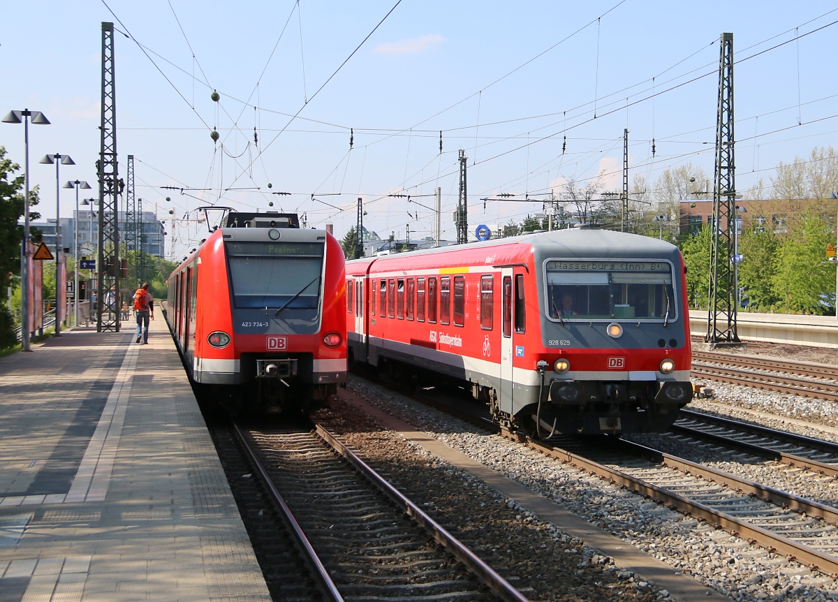 Generationen-Treff am Heimeranplatz: 423 734-3 als S Bahn nach Pasing trifft auf 628 629 mit 628 567 nach Wasserburg. Aufgenommen am 25.04.2014.