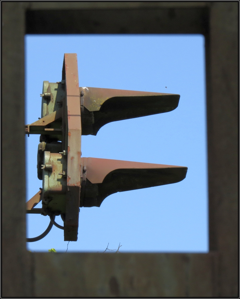 Der Blick durch den Vorsignalmast auf das Vorsignal an der Montzenroute am Gemmenicher Weg unweit von Aachen. Szenario vom 12.Juni 2015.