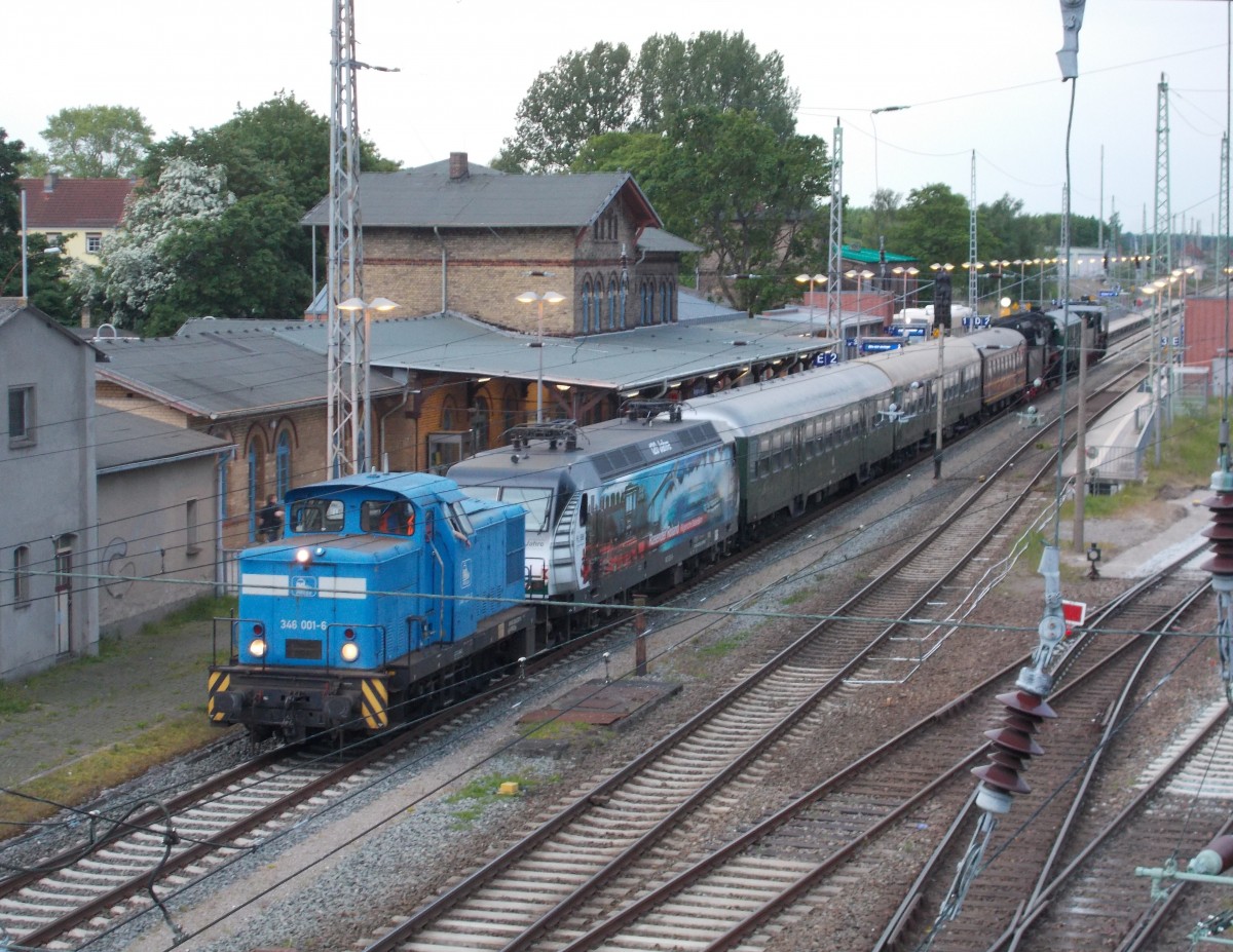 PRESS 346 001 holte,am 31.Mai 2015,die PRESS 145 023,35 1097 und die 50 3501 nachdem Ende des Bahnhofsfestes von Putbus ab.Hier nach der Ankunft in Bergen/Rügen.
