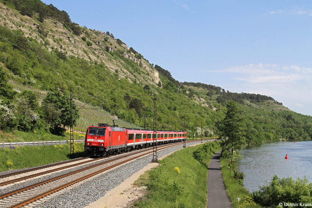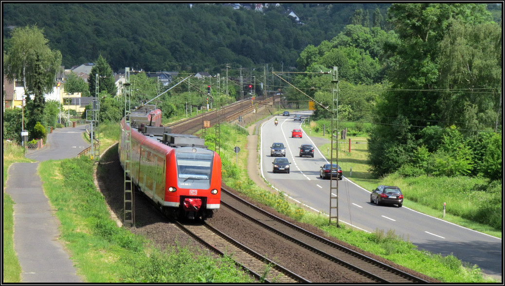Der Blick auf die rechte Rheinstrecke unweit von Erpel bei Kasbach am 09.Juni bildlich festgehalten. Gerade kommt ein Regionalzug in den Gleisbogen gefahren.