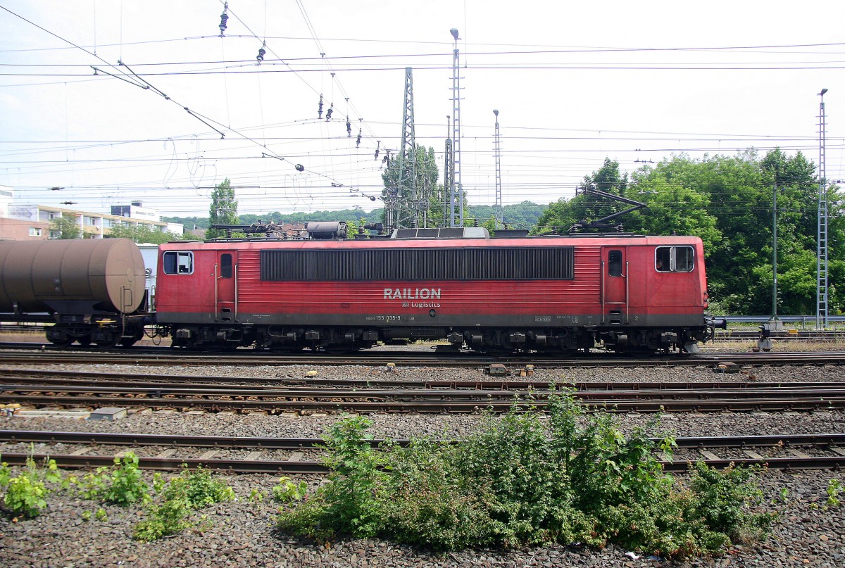 155 035-9 von Railion fährt mit einem langen Kesselzug aus Antwerpen-BASF(B) nach Ludwigshafen-BASF bei der Ausfahrt aus Aachen-West und fährt in Richtung Aachen-Schanz,Aachen-Hbf,Köln. Aufgenommen vom Bahnsteig in Aachen-West. Bei schöem Sonnenschein am Mittag vom 13.6.2015.