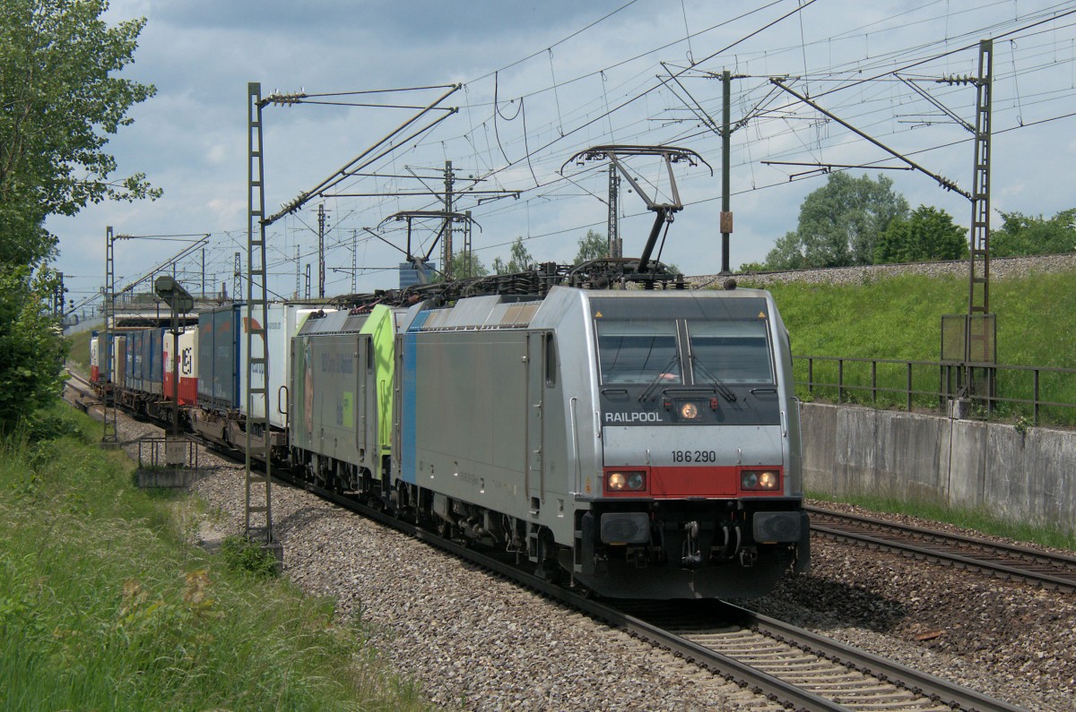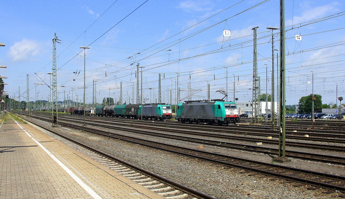 Die beiden BLS 186 103 und 186 105 kommen auch bei Neuss Vogelsang gen Krefeld mit einem Kastelzug am Sonntag den 14. Juni 2015 gefahren.