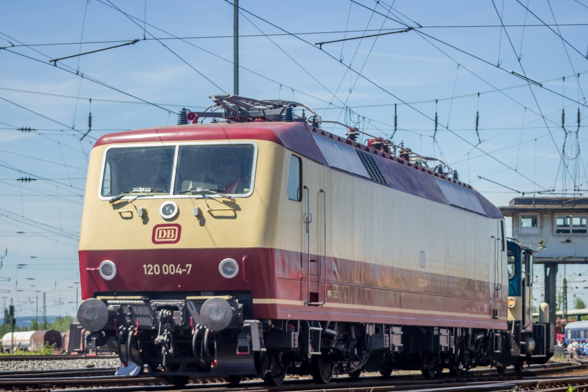 50 Jahre Baureihe 103. Zur Feier des Tages präsentiert sich 120 004-7 anlässlich der Lokparade im DB Museum Koblenz-Lützel zu Ehren des 50. Geburtstages. Am 14.06.1965 wurde E03 001 von der Deutschen Bundesbahn abgenommen und läutet damit den Beginn einer Ära ein.