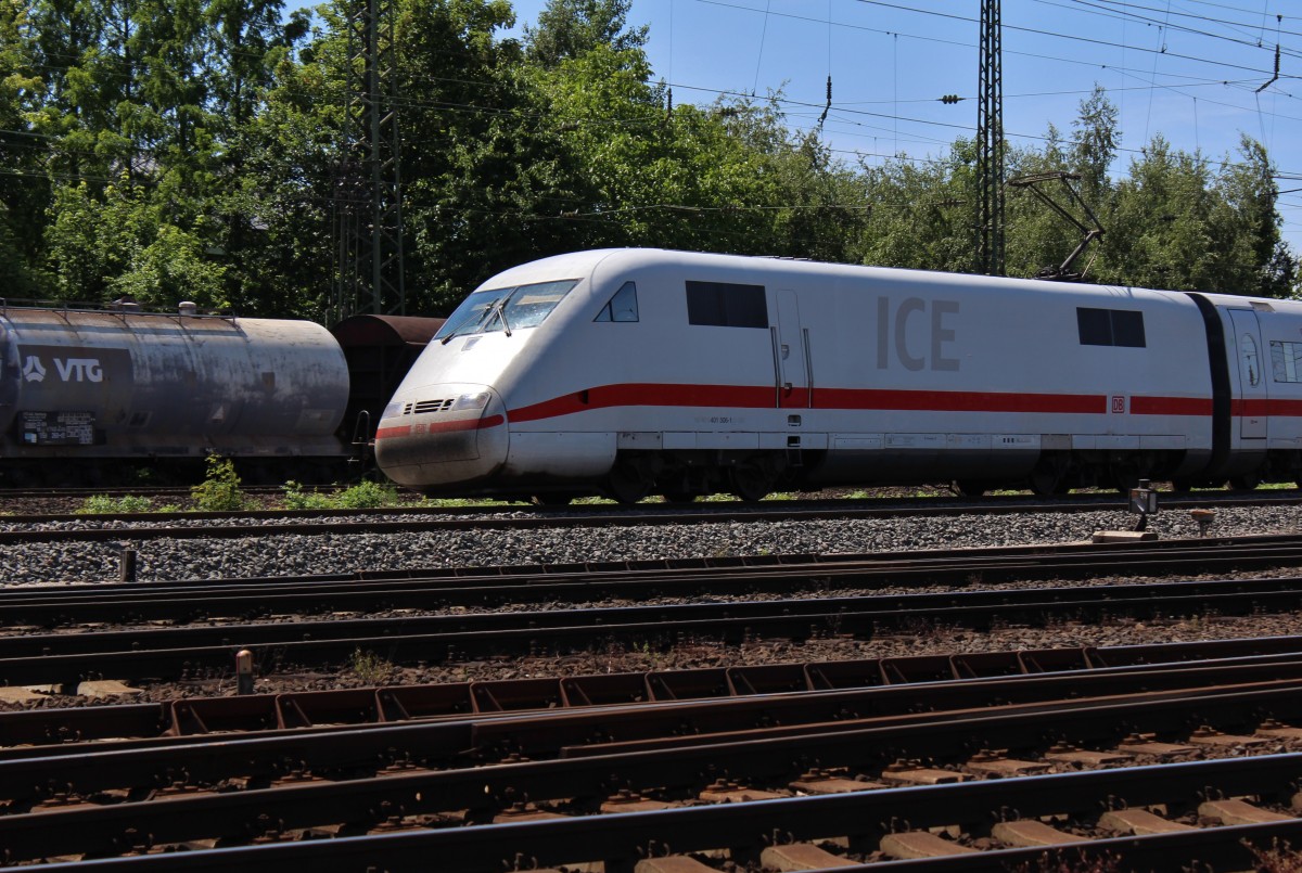 Am 14.06.2015 war ICE-Tz 0106 "Itzehoe" als ICE 1025 von Hamburg nach Frankfurt unterwegs. Hier u sehen ist der "nicht zählend Kopf" 401 506-1 bei der Vorbeifahrt am DB Museum Koblenz-Lützel.