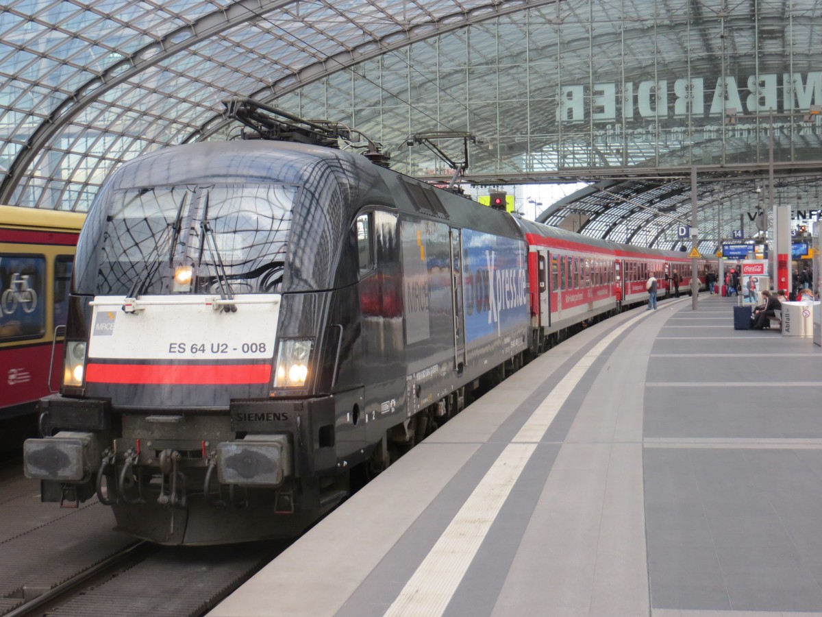 Die ES 64 U2-008 der MRCE, vermietet an DB Regio Nordost, am 13.04.2015 mit dem abendlichen IRE von Berlin-Ostbahnhof nach Hamburg Hbf hier im Berliner Hbf.