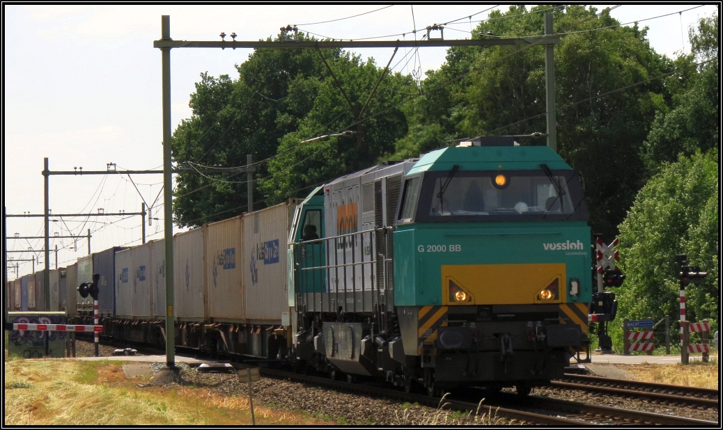 Die Vossloh G2000 BB von Locon zieht ihren Containerzug in Richtung Roermond.Hier zu sehen unweit der Gemeinde Echt-Susteren in Limburg,Niederlande im Juni 2015.
