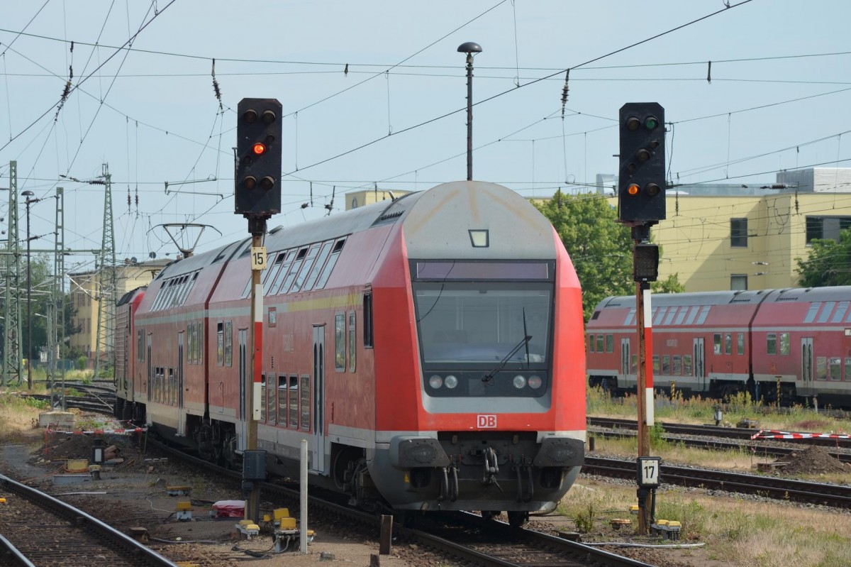 Brückenstellwerk Hp 5 Halle (Saale) unterdem gerade der RB nach Nordhausen Doppelstocksteuerwagen DB 50 80 86-03 129-3 DABbuzfa voraus bereitgestellt wird 14.06.2015