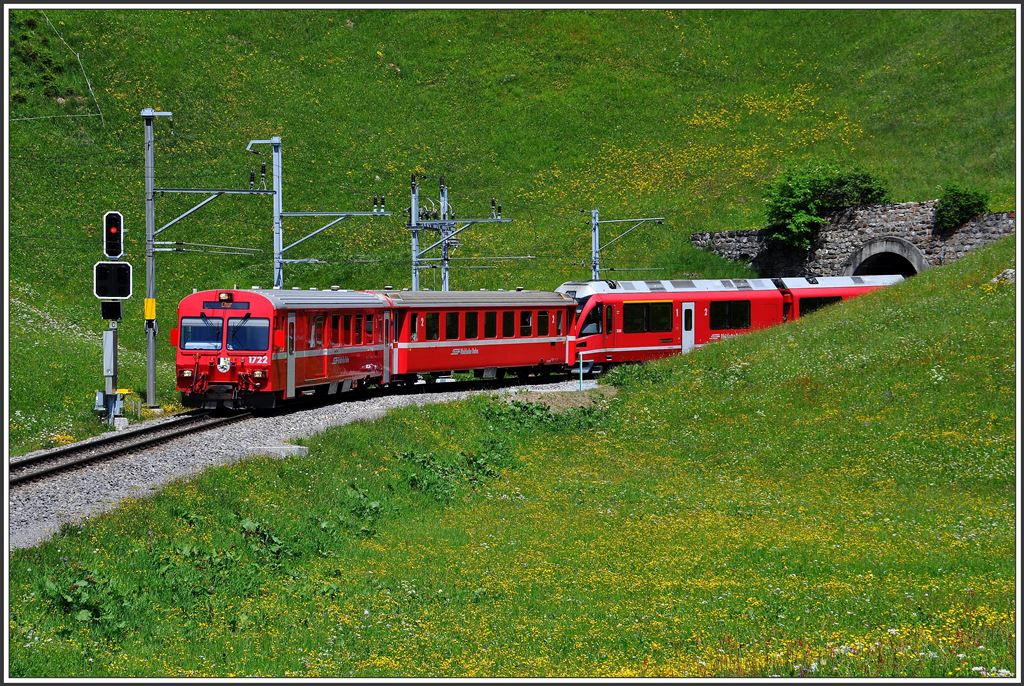 R1436 mit Steuerwagen 1722 und Allegra 3508 verlässt den Arosatunnel . (11.06.2015)