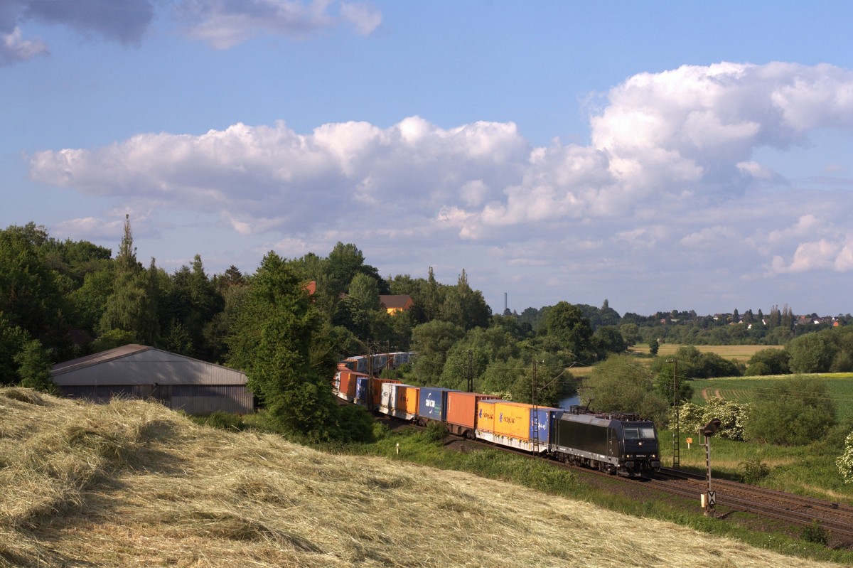 185 574-1 zieht am Abend des 16.06.2015 einen Containerzug durchs Leinetal kurz vor Elze