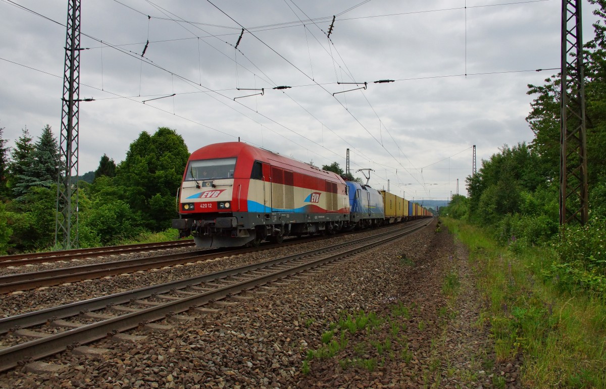 420 12 von EVB und 182 912-6 von MWB sind am 10.06.15 mit einen Containerzug bei Fulda in Richtung unterwegs.