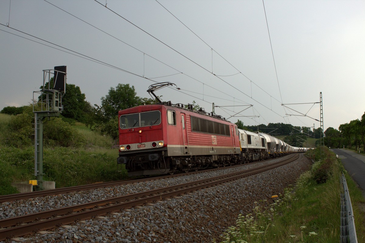 Die MEG 707 und die Class 247 042-5 ziehen den Zementleerzug nach Rüdersdorf. Bei der Aufnahme vom 13.06.2015 passieren sie das Signal bei Liebau/Pöhl.
