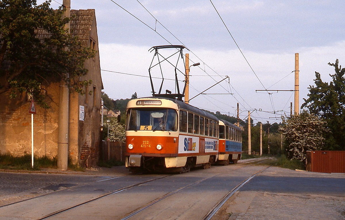 Kurz vor der Endhaltestelle wurde der der Tatra-Tw 222 415-4 der Dresdner Straßenbahn Anfang Mai 1993 in Weinböhla aufgenommen