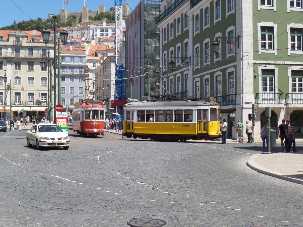 Lissabon, Praça da Figueira (Platz des Feigenbaums) am 19.5.2015: Straßenbahnwagen Nr. 575, gelb-weiße Standard Lackierung - beim Wechseln der Stromabnahmeart - und Stadtrundfahrtwagen, weiß-rote Lackierung, beide vom Typ Remodelados, gebaut 1935-1940, 1995/96 aufgearbeitet, Lüp 8,38, B 2,38, 50 kW, Stangen- + Bügelstromabnehmer /