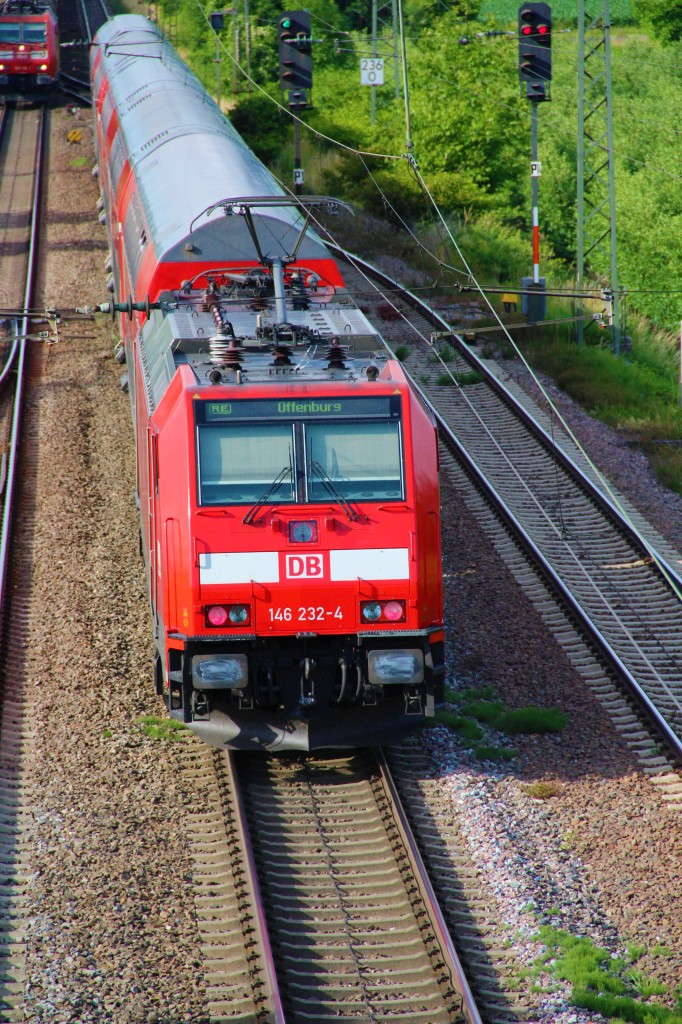 Nachschuss auf 146 232-4 mit ihrem RE nach Offenburg bei der Ausfahrt aus Müllheim (Baden). Im Hintergrund kommt 185 116-1 entgegen. 17.06.2015