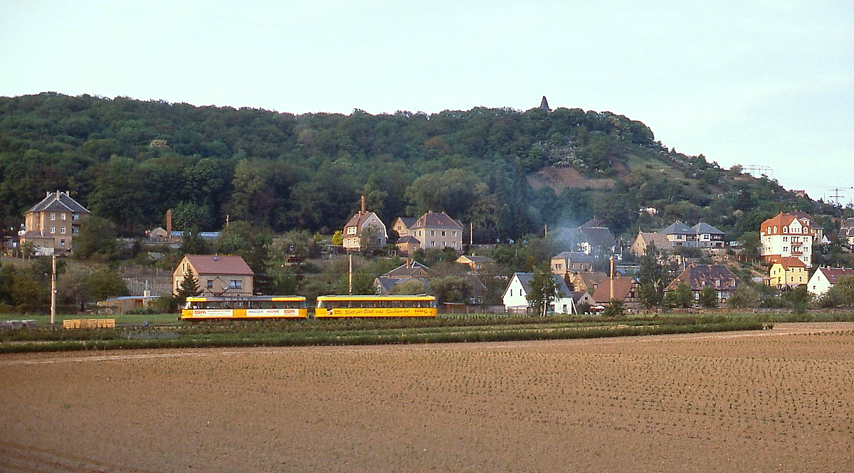 Zwischen Coswig und Weinböhla hat die Linie 5 der Dresdner Straßenbahn Überlandbahncharakter, Anfang Mai 1993 ist hier eine Tatra-Garnitur nach Weinböhla unterwegs