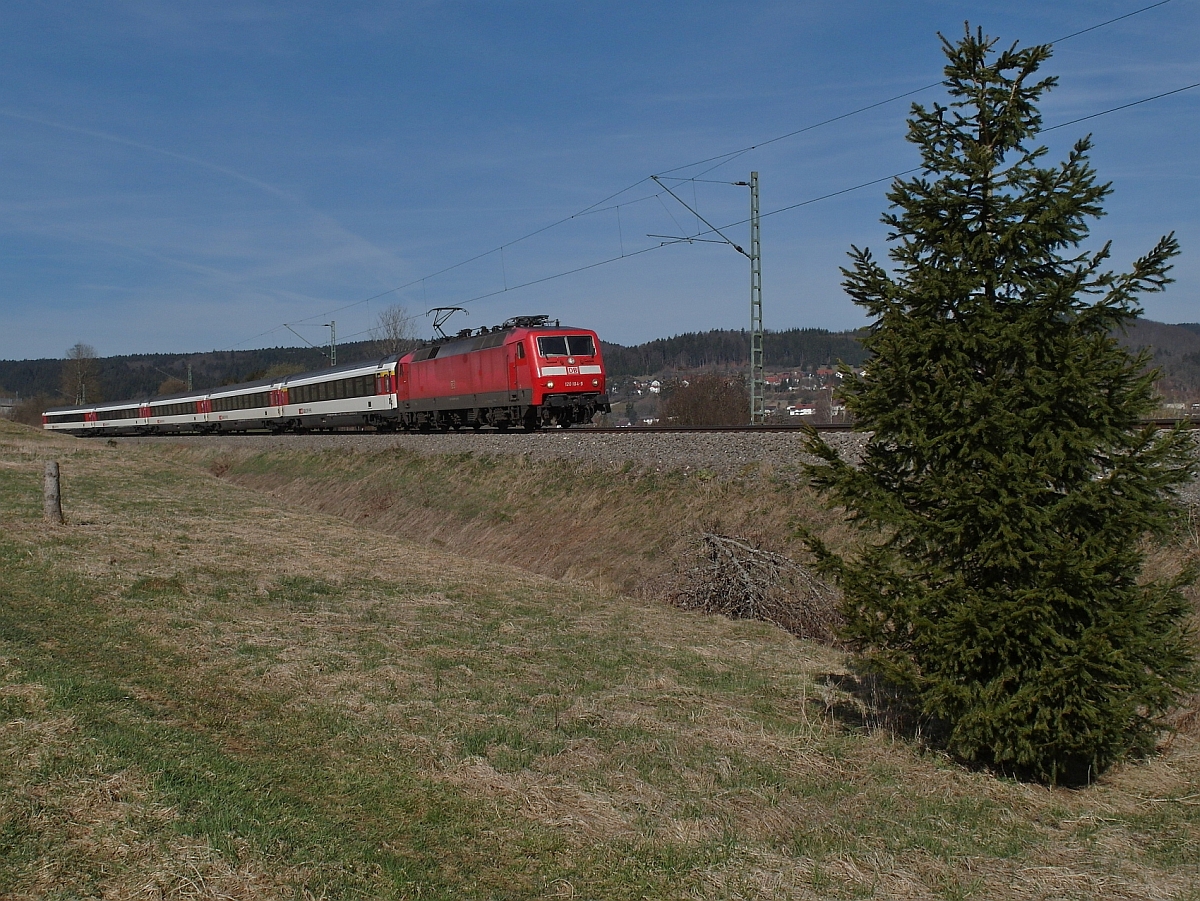 IC 181, Frankfurt (M) - Zürich, wird am 10.04.2015 von 115 350-1 gezogen. Aufnahme entstand in der Nähe von Möhringen.