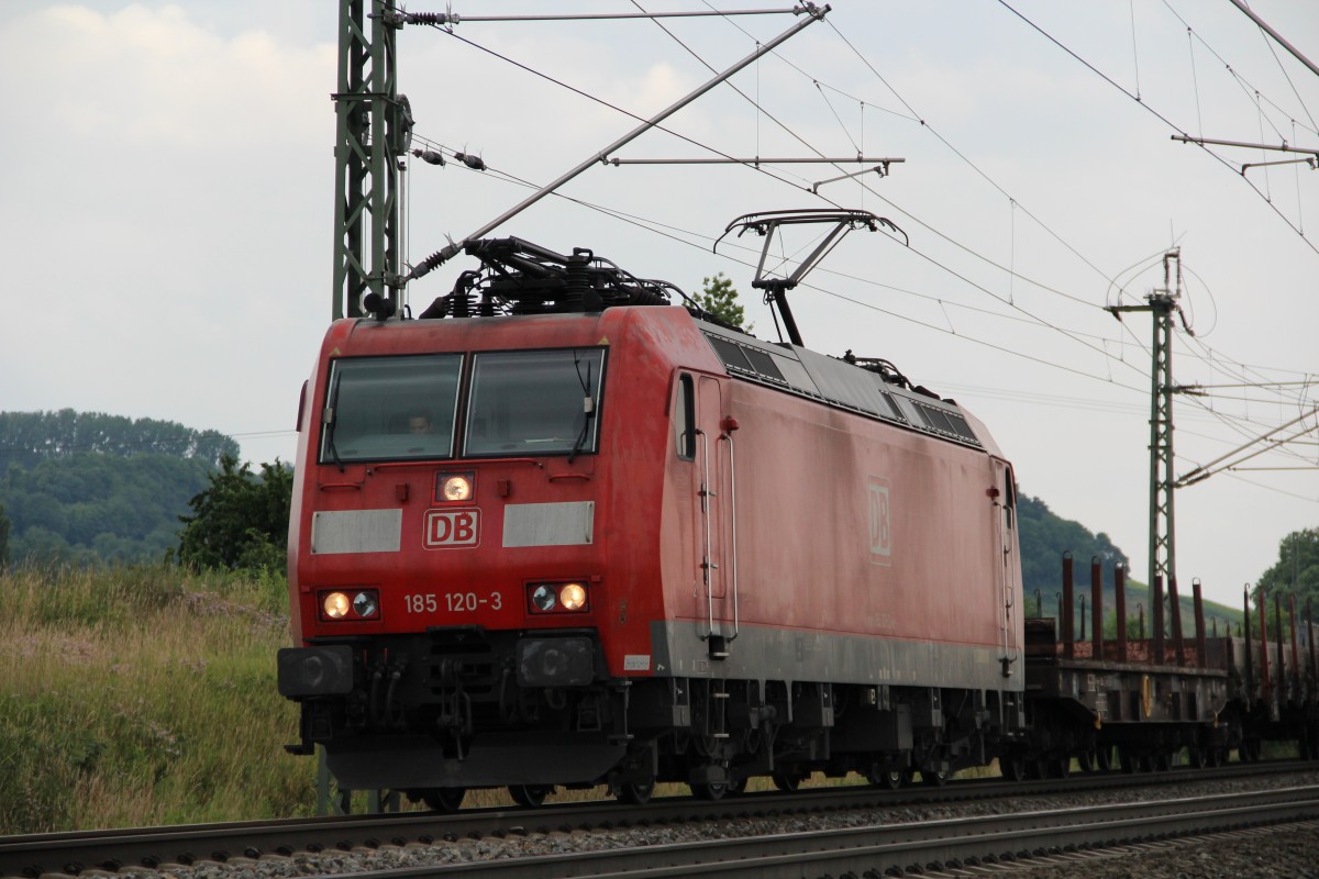 185 120-3 mit gemischtem Güterzug am 20.06.2015 gen Norden kurz nach Schliengen.