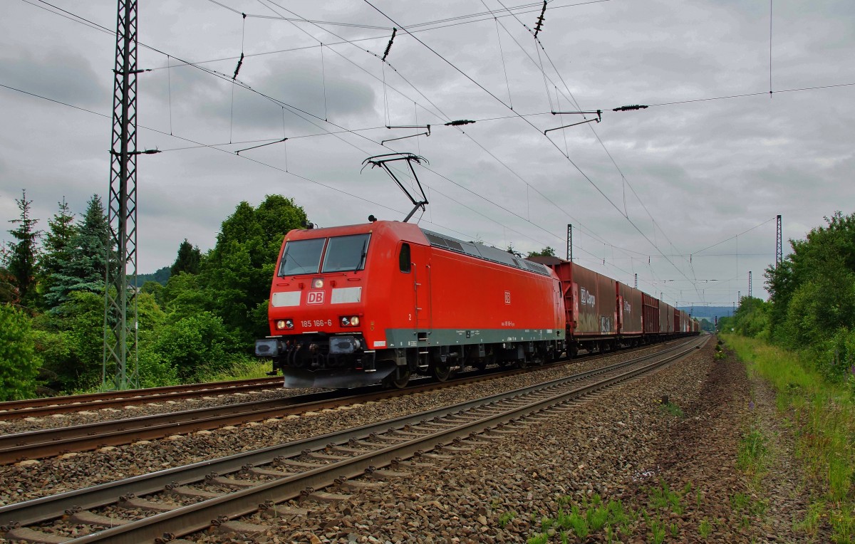 185 166-6 ist am 10.06.15 mit einen kurzen Güterzug bei Fulda unterwegs.