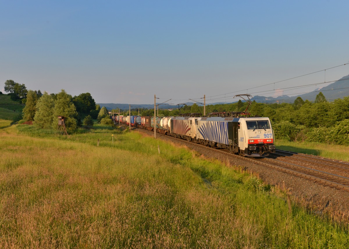 Und noch eine Schweizer Dame kam am 20.06.2015 in Schliengen vorbei - 482 008-0 mit KLV Zug am Haken.