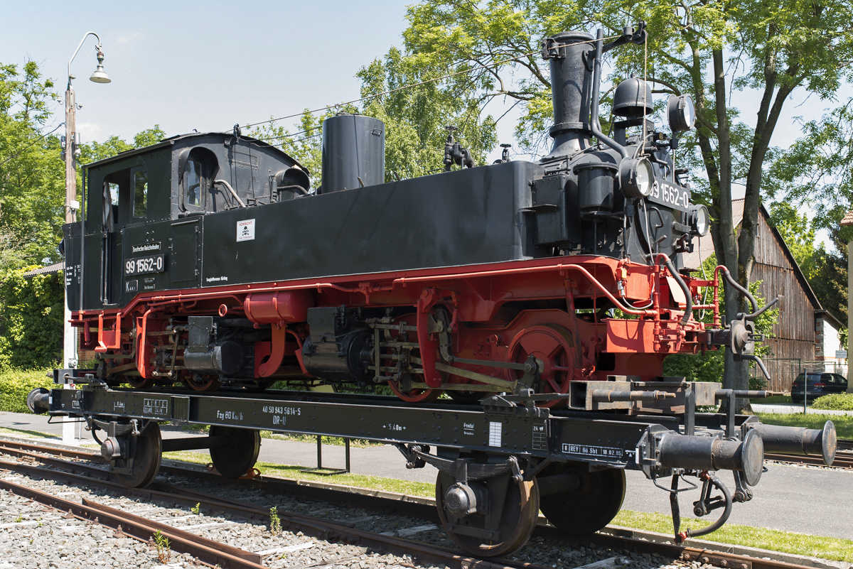 750 mm Schmalspurlok 99 1562-0 auf einem regelspurigen Flachwagen. Deutsches Dampflokmuseum Neuenmarkt-Wirsberg, 04.06.2015 öffentlich zugängliches Museumsgelände Hersteller: Richard Hartmann, Chemnitz Fabriknummer: 3215 Baujahr: 1909 Betreibernr. z.Z.d. Aufnahme: 99 1562-0 ursprüngl. Fahrzeugnr.: IV K 152 (sächs) Umzeichnungen: 99 562 (?); 99 1562-0 (01.07.1970); 099 704-9 (01.01.1992)