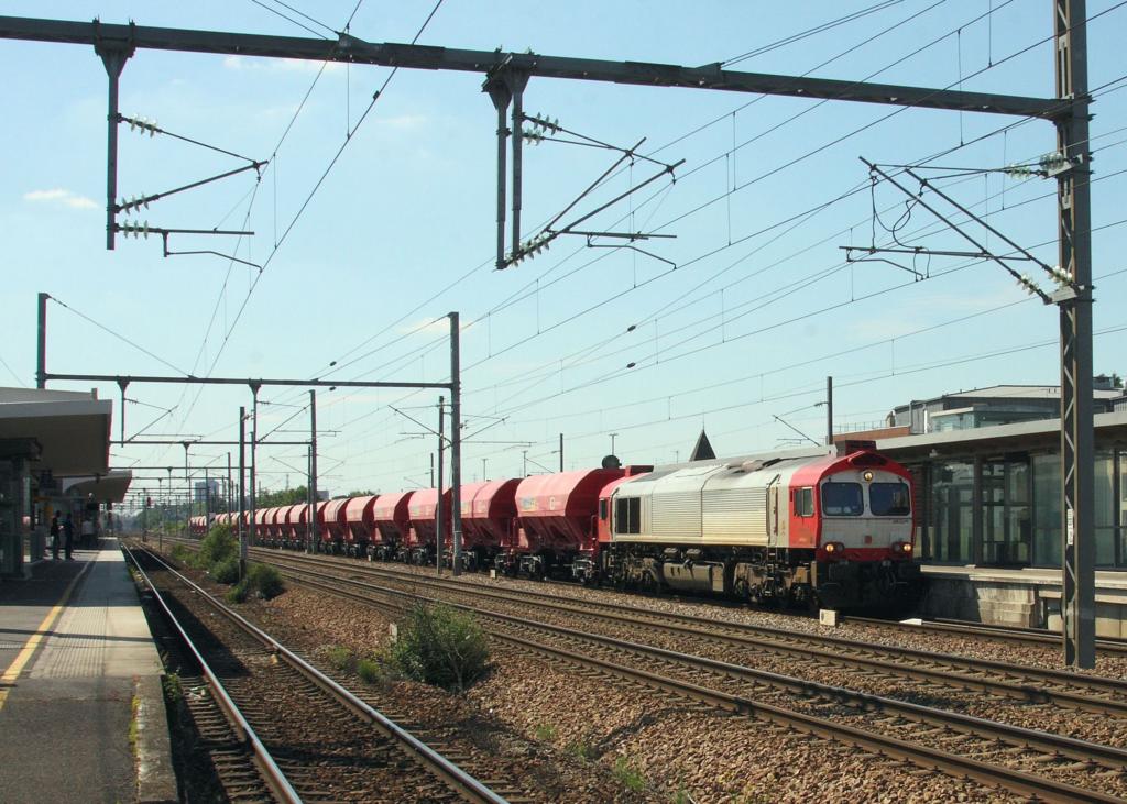 Luxemburg, Capellen, Linie 50 Luxemburg-Kleinbettingen-Arlon. RB Luxembourg-Kleinbettingen:  Dosto Steuerwagen, 2 DOSTOS, geschoben von der CFL 3004 unter 3 kV Gleichstrom. Fotografiert vom Radweg Capellen-Windhof aus, auf der Höhe der Autobahnraststätte Capellen (im Hintergrund). 19.06.2015