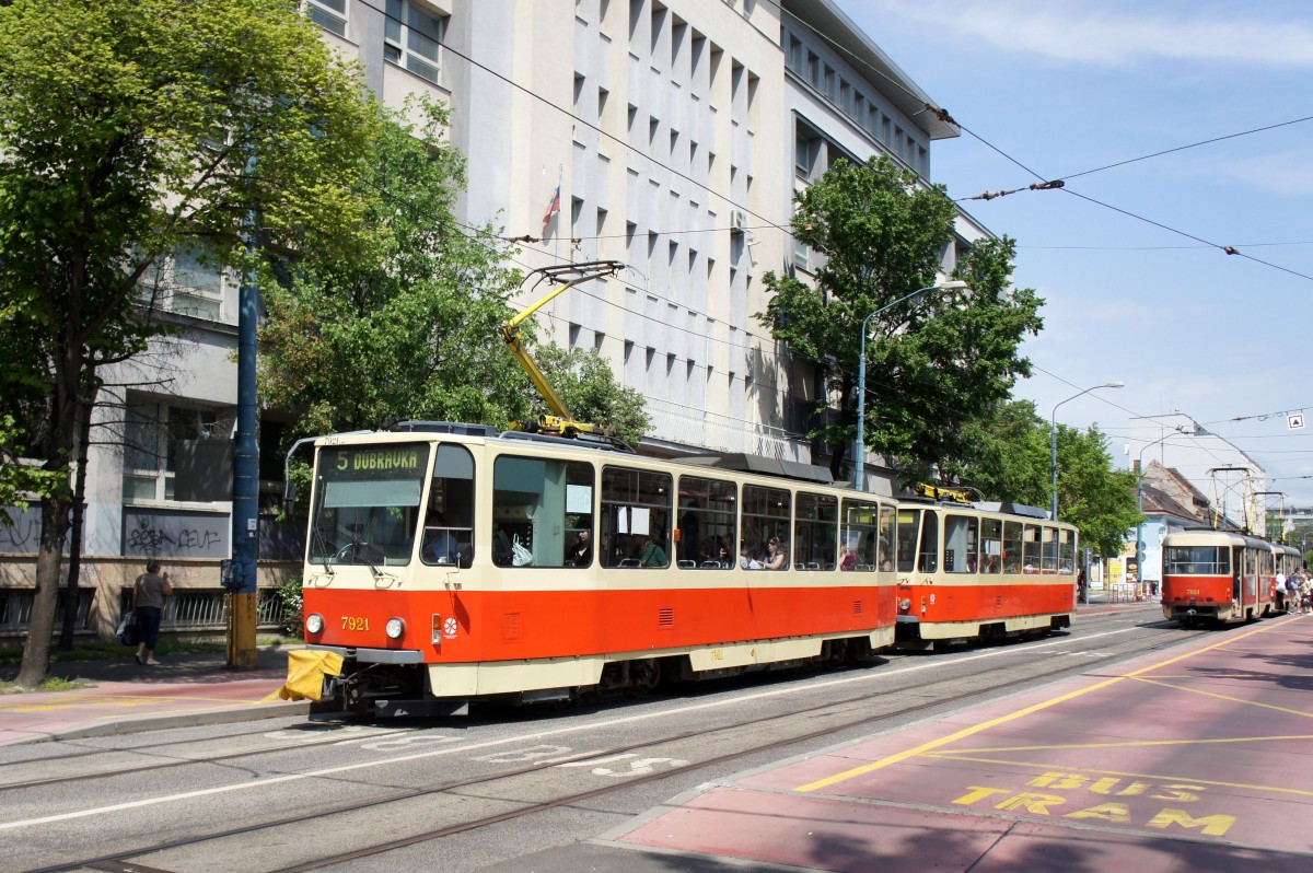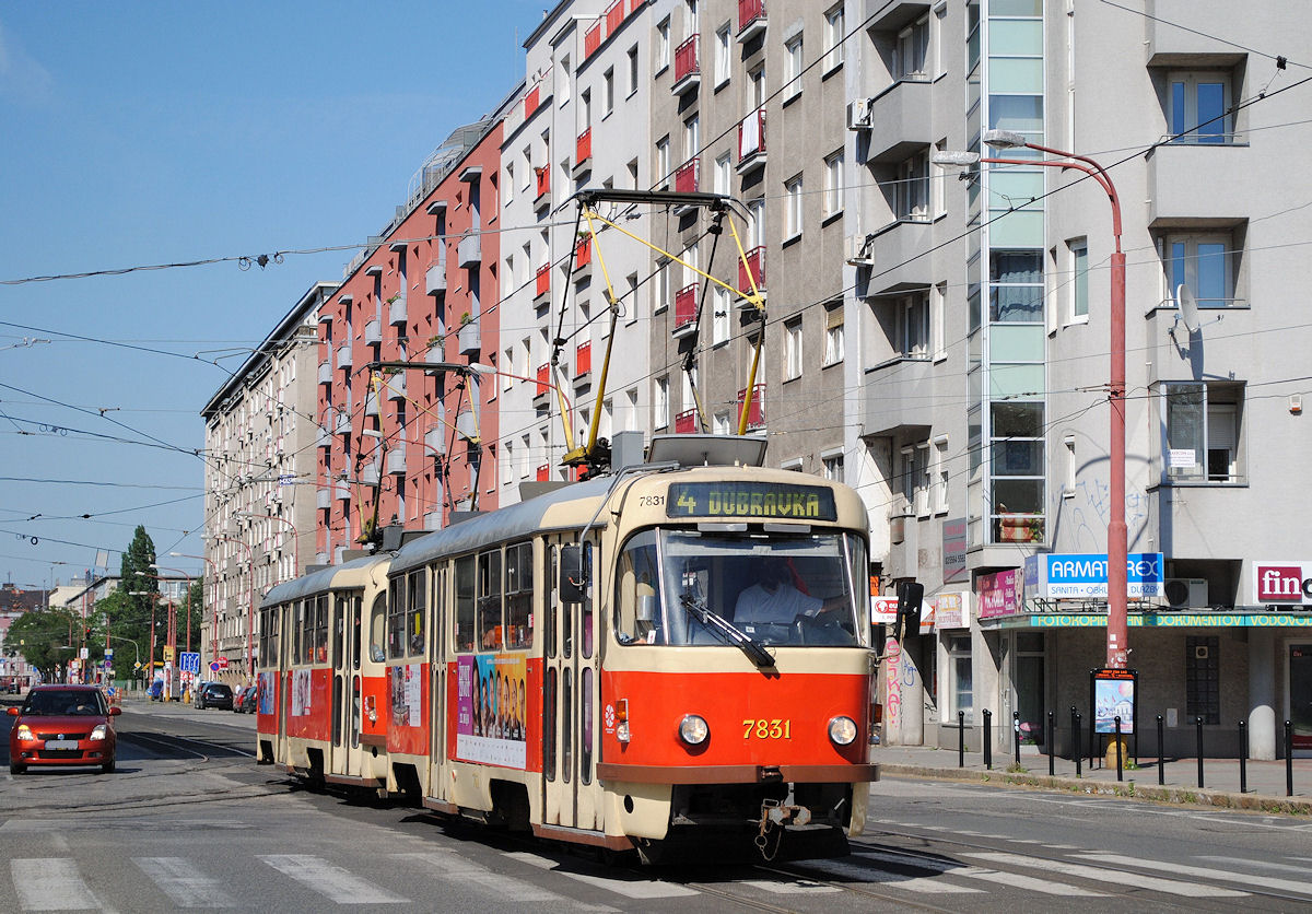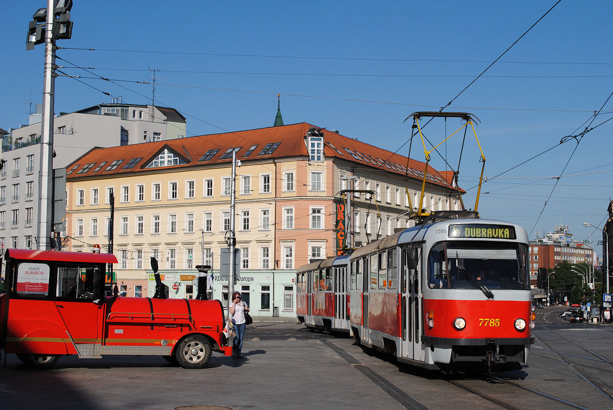 Tw.7785+7786 überqueren den Hurbanovo nam. in Richtung Dubravka. (06.06.2015)