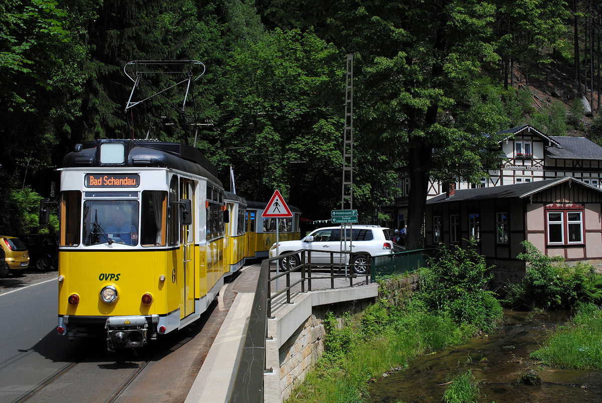 Eine vom Tw.6 gezogene Dreiwagengarnitur verläßt die Endstelle Lichtenhainer Wasserfall. (10.06.2015)