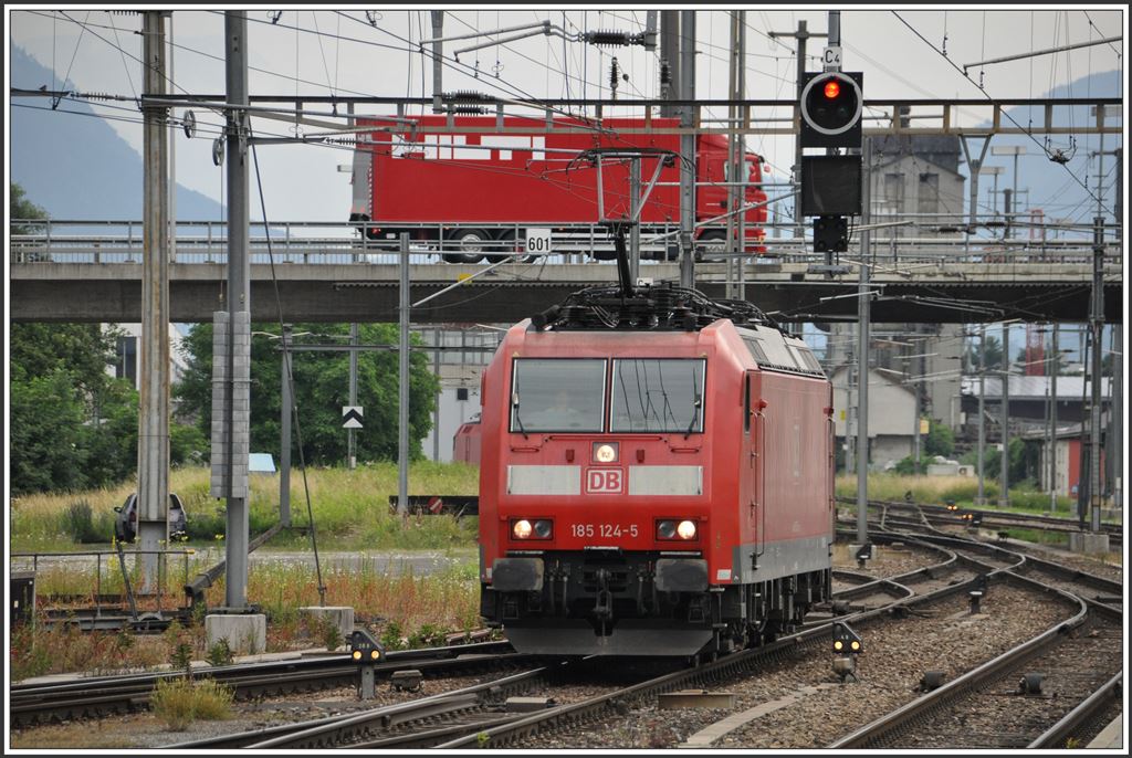 Crossrail 185 596-4 am 12.07.2014 mit einem Containerzug nach Itlaien bei der Ausfahrt vom Gütergleis am Abzweig Leutersberg.