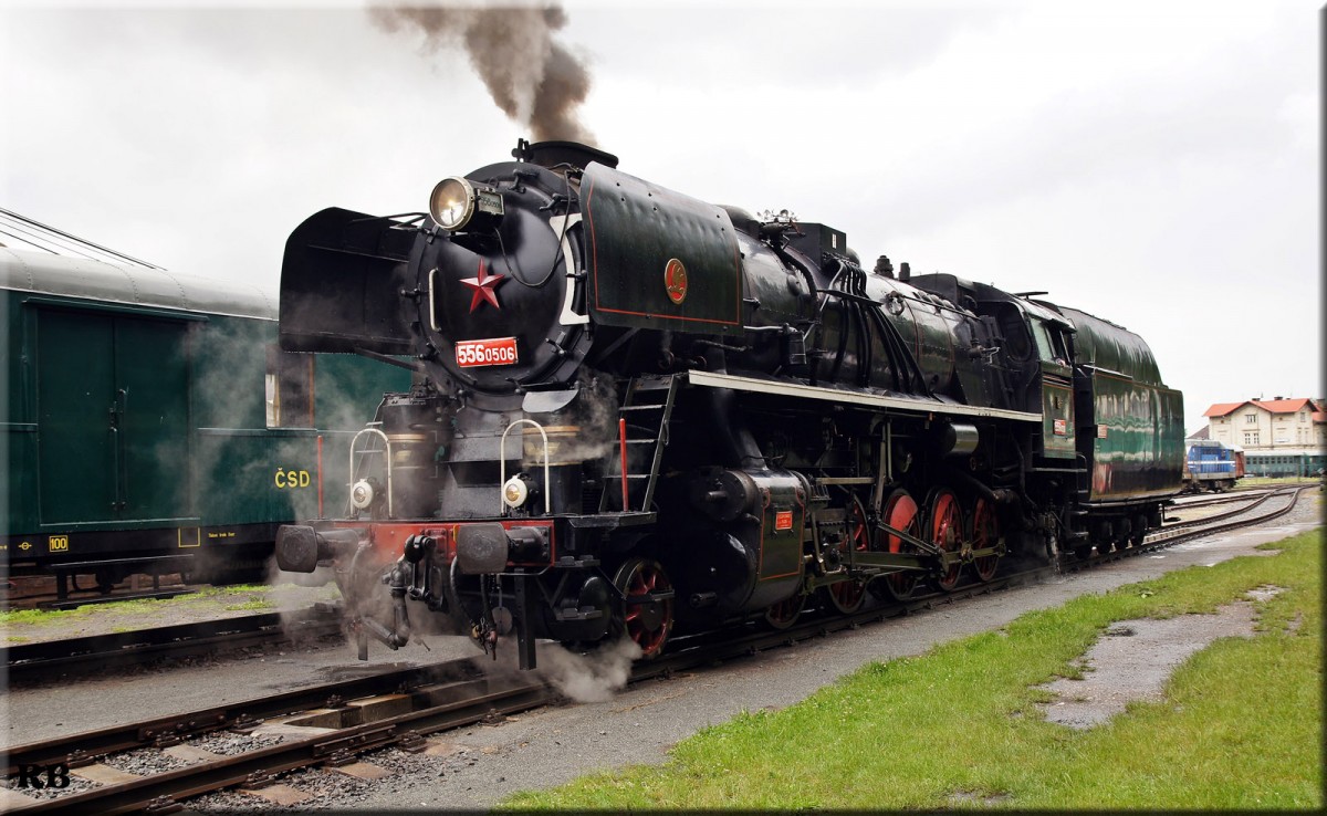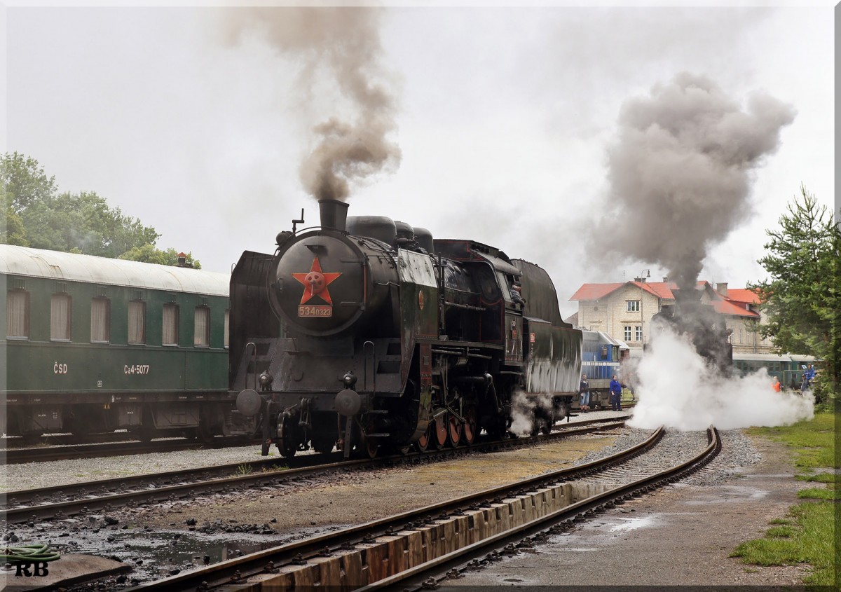 Sonderzug mit 534 0323 mit ihren Sonderzug bei der Ausfahrt aus dem Bahnhof von Luzna u.Rakovnika. Auf dem Nebengleis steht 112 565 mit ihren Sonderzug aus Chemnitz. Aufgenommen am 20.06.2015