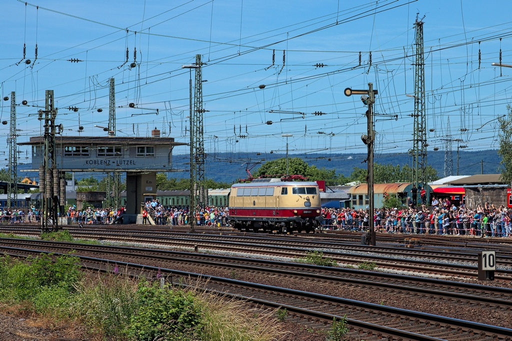 50 Jahre Baureihe 103. Zur Feier des Tages präsentiert sich E03 001 anlässlich der Lokparade im DB Museum Koblenz-Lützel zu Ehren ihres 50. Geburtstages. Am 14.06.1965 wurde E03 001 von der Deutschen Bundesbahn abgenommen und läutet damit den Beginn einer Ära ein.