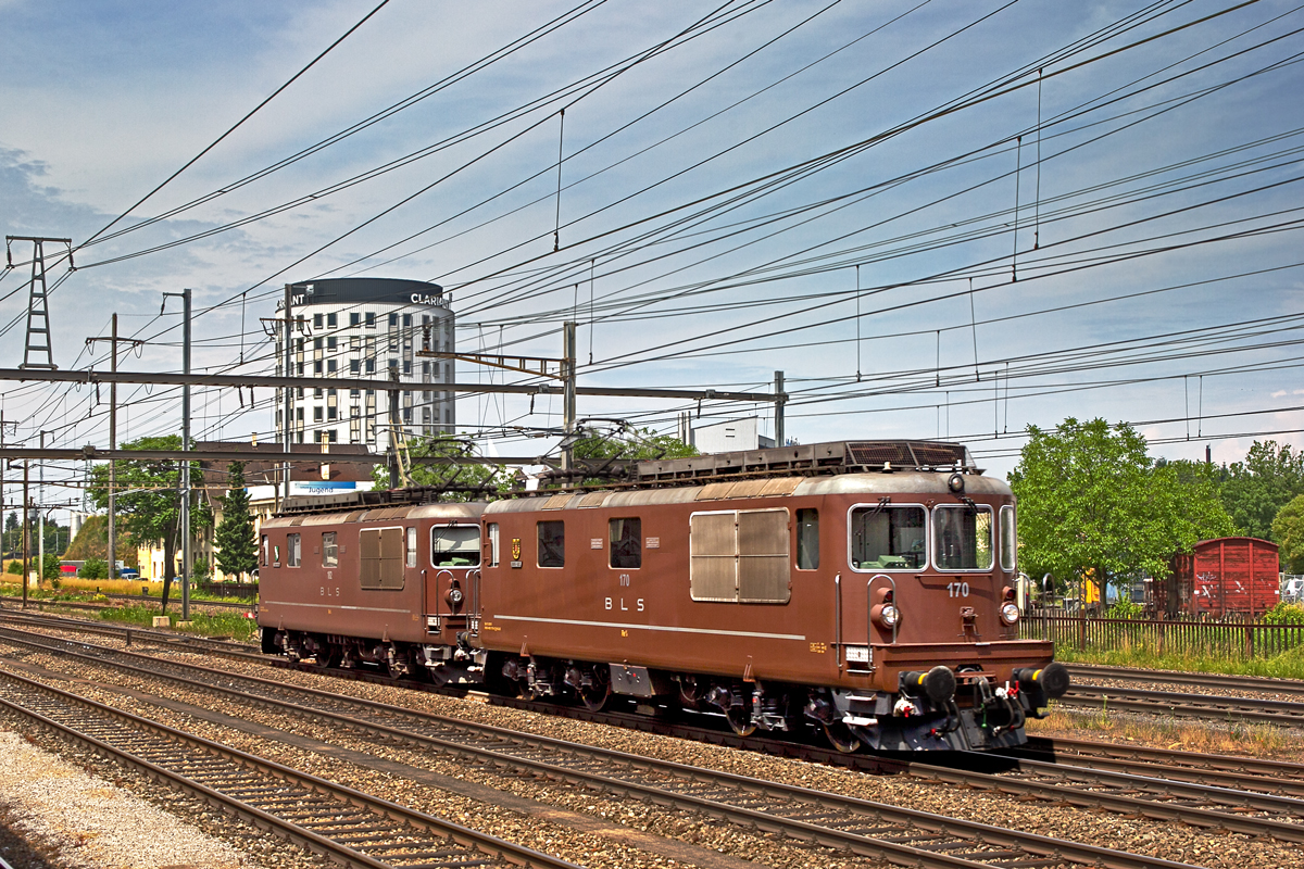 Lokzug aus der Re 425 170 "Brig-Glis und der der Re 425 182 "Kandergrund" durchfahren Pratteln.Bild Juni 2015