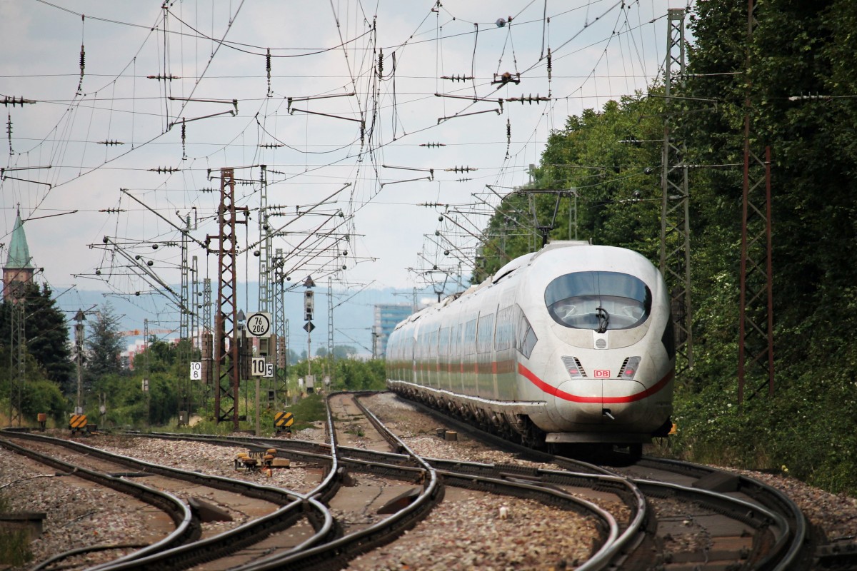 Nachschuss auf 403 022-7 "München" als dieser mit einer zweiten Einheit am 12.07.2014 beim Abzweig Leutersberg auf dem Weg nach Freiburg (Breisgau) Hbf ist.