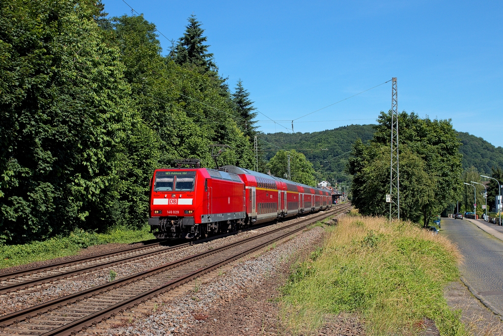 Normalerweise kommt der RE 5 nach Koblenz geschoben. Am 14.6.2015 war aber der RE 10511 mit 146 029 umgekehrt gereiht. Mit +1 ging es aus Oberwinter heraus