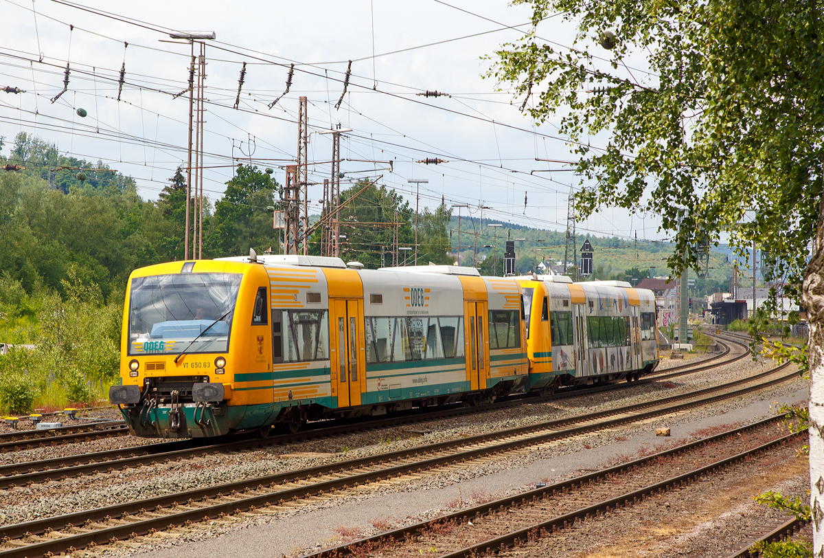 Zwei gekuppelte, von der HLB (Hessische Landesbahn) angemietete, Stadler RegioShuttle RS 1 (BR 650) der Ostdeutsche Eisenbahn GmbH, fahren am 18.06.2015, als DreiLänderBahn RB 93 "Rothaarbahn" (Bad Berleburg - Kreuztal - Siegen), von Kreuztal weiter in Richtung Siegen.