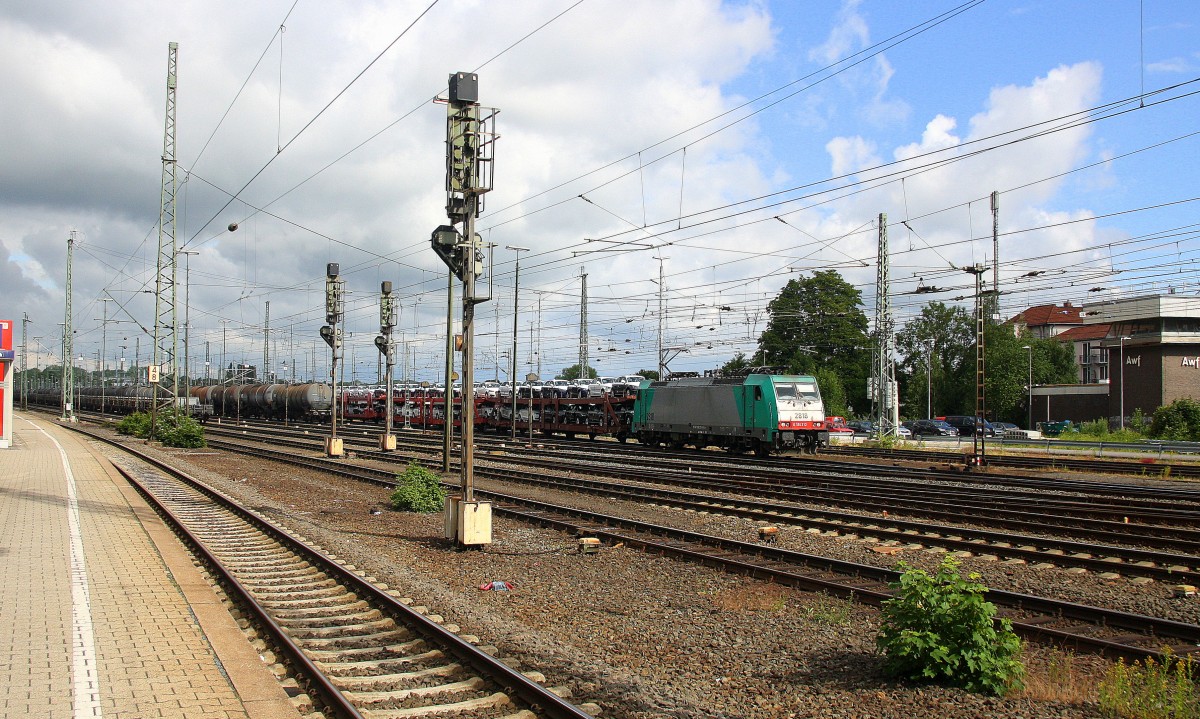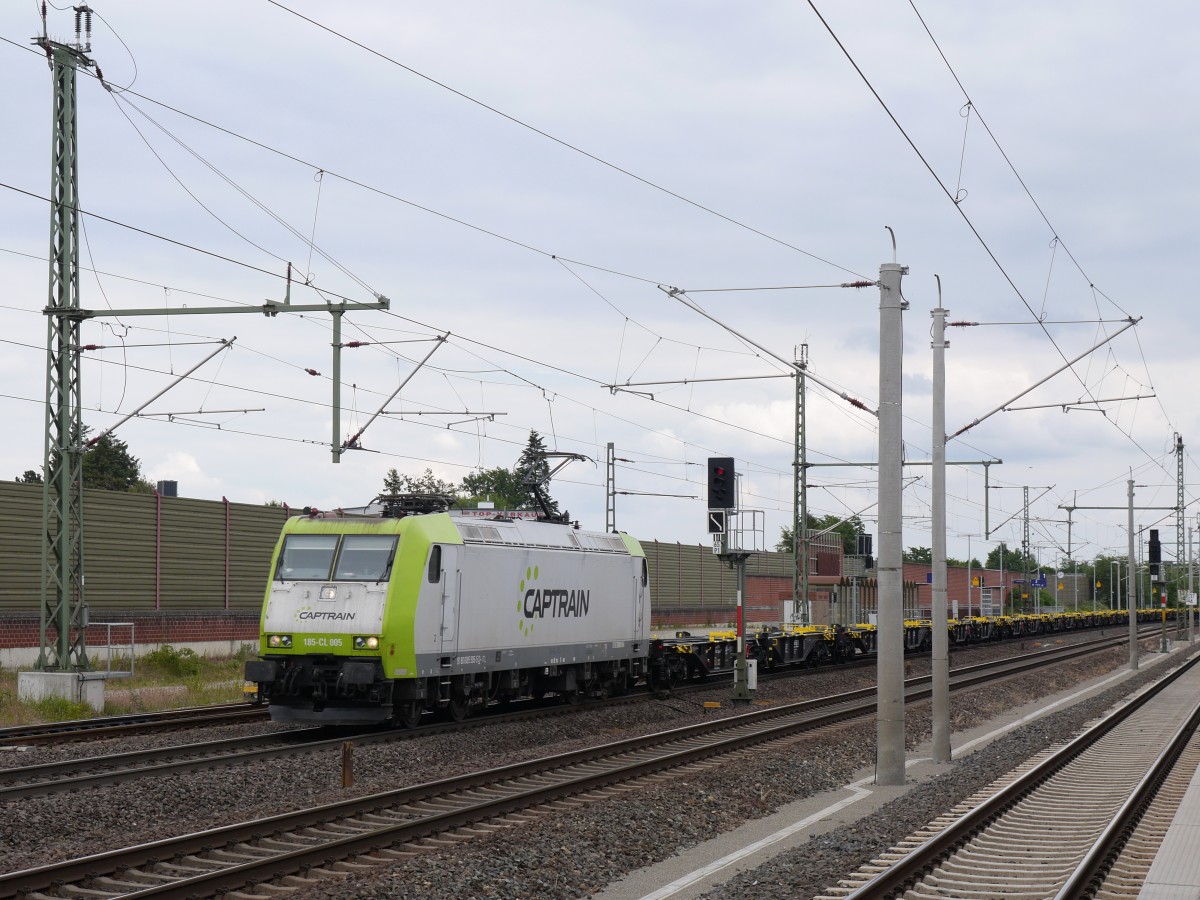 CAPTRAIN 185-CL 005 kommt mit einem Zug leerer Autowaggons durch Bardowick in Richtung Hamburg; 21.05.2015