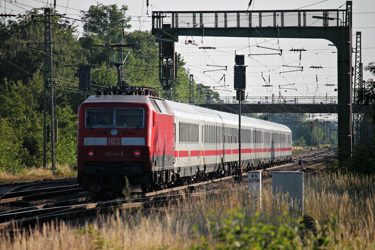 Nachschuss auf 120 140-9, als sie am frühen Morgen des 15.07.2014 mit dem IC 2265 (Basel Bad Bf - München Hbf) durch den Bahnhof von Orschweier gen Lahr (Schwarzw) fuhr.
