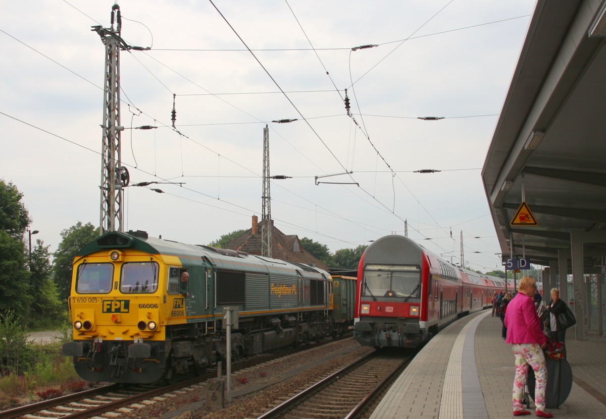 27.6.2015 Bernau (bei Berlin), FPL 66006/3650 005-3 mit Ganzzug wird vom RE 3 überholt.