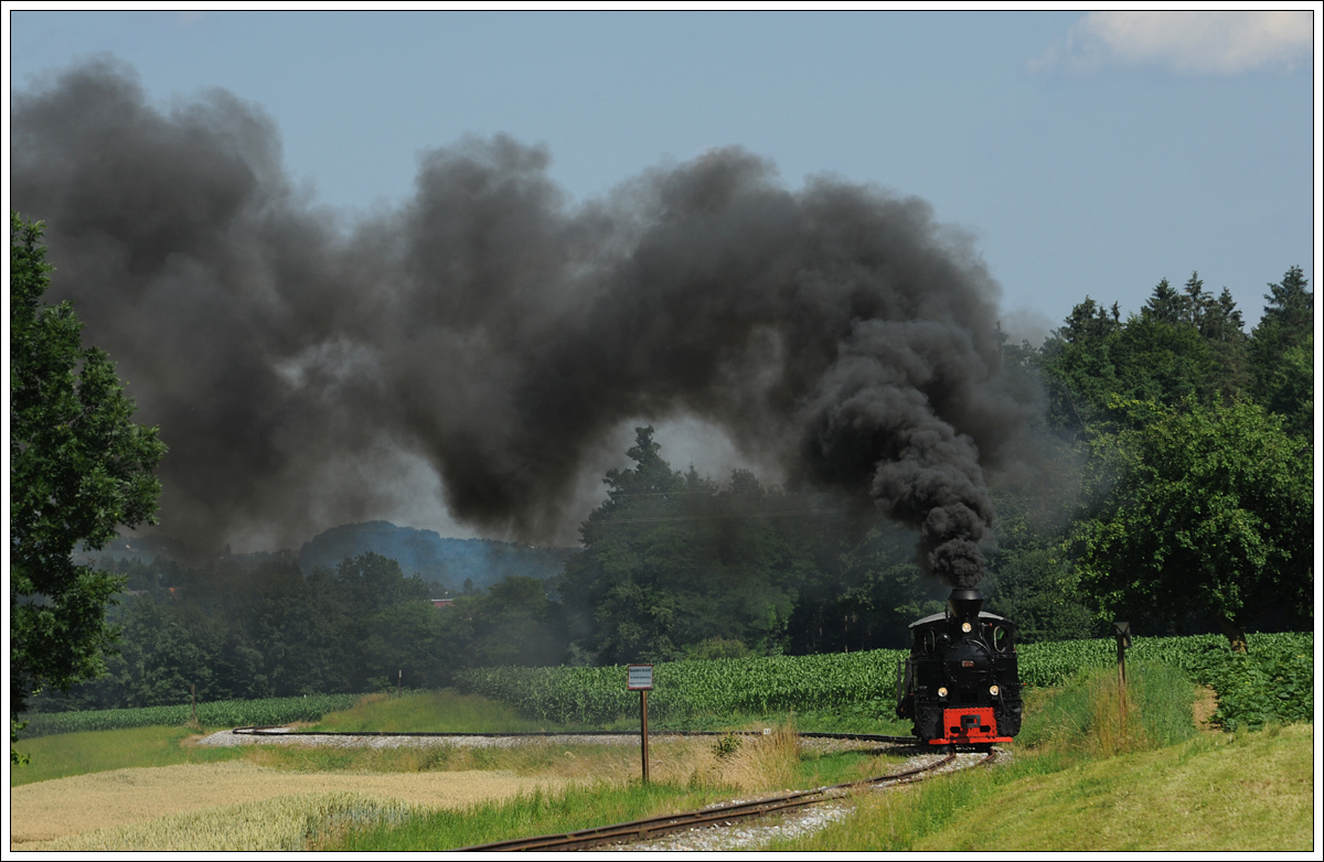 Nach der Ankunft in Stainz ging es für den Zug wieder Richtung Preding . Die Morgensonne lässt die Bahn in einem eigenem Licht erstrahlen da die sonstigen Zugfahrten erst Nachmittags stattfinden. MK48.2019 am 26.Juni 2015