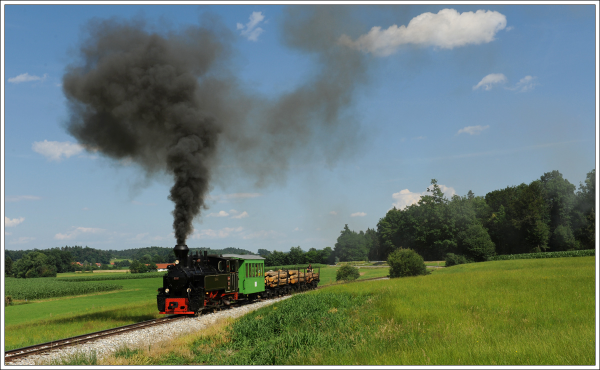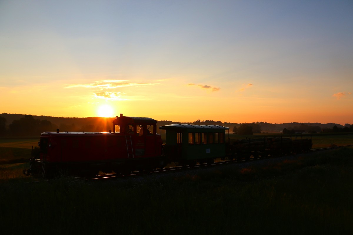 Nach der Ölmühle taucht die Sonne den Güterzug und das Gras in goldenes Licht. 26.06.2015 MK48.209 mit einem Holzzug.