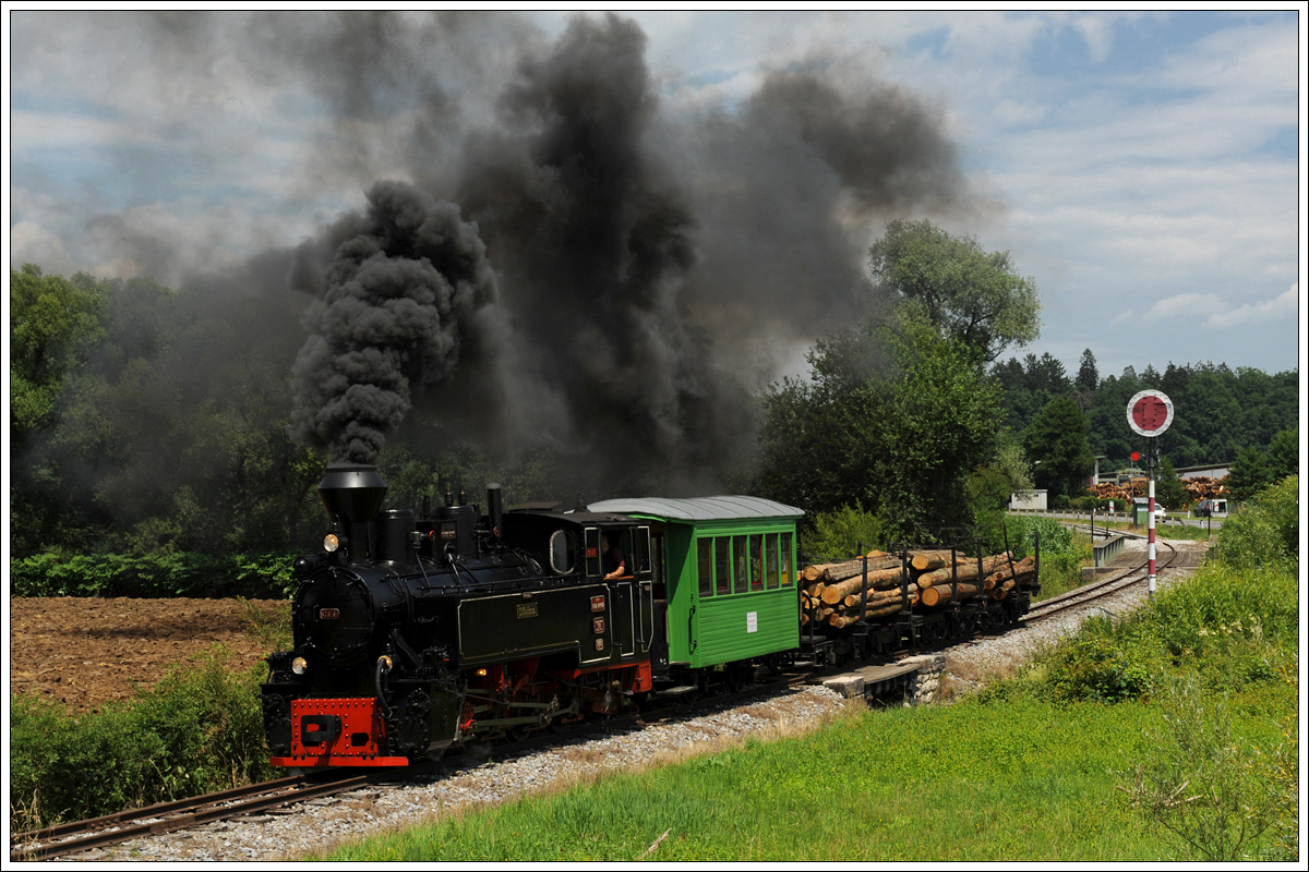 Ein zweites mal an diesem Tag kam Mk48.2019 vor dem Zug zum Einsatz. Am Abend durfte Sie die Stilechten Waldbahnwagen die mit Holz beladen waren nach Wohlsdorf bei Preding Wieselsdorf zurückstellen. Hier im Bild mit dem einzigen übriggebliebenen Fahrzeug der Fürst Liechtensteinschen Waldbahn bei Deutschlandsberg. 26,06,2015