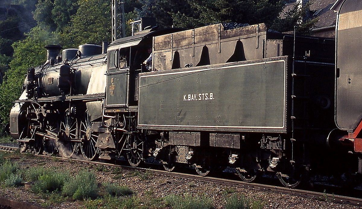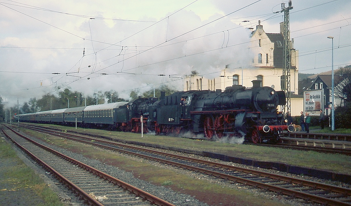 Leider nur sieben Jahre war die wunderschöne badische IVh 18 316 nach ihrer Aufarbeitung 1995 im Einsatz, 2002 wurde sie mit einem Radschaden schon wieder abgestellt. Im Frühjahr 1999 beförderte sie gemeinsam mit der 38 2267 einen Sonderzug auf der Siegstrecke, hier bei der Durchfahrt in Schladern.