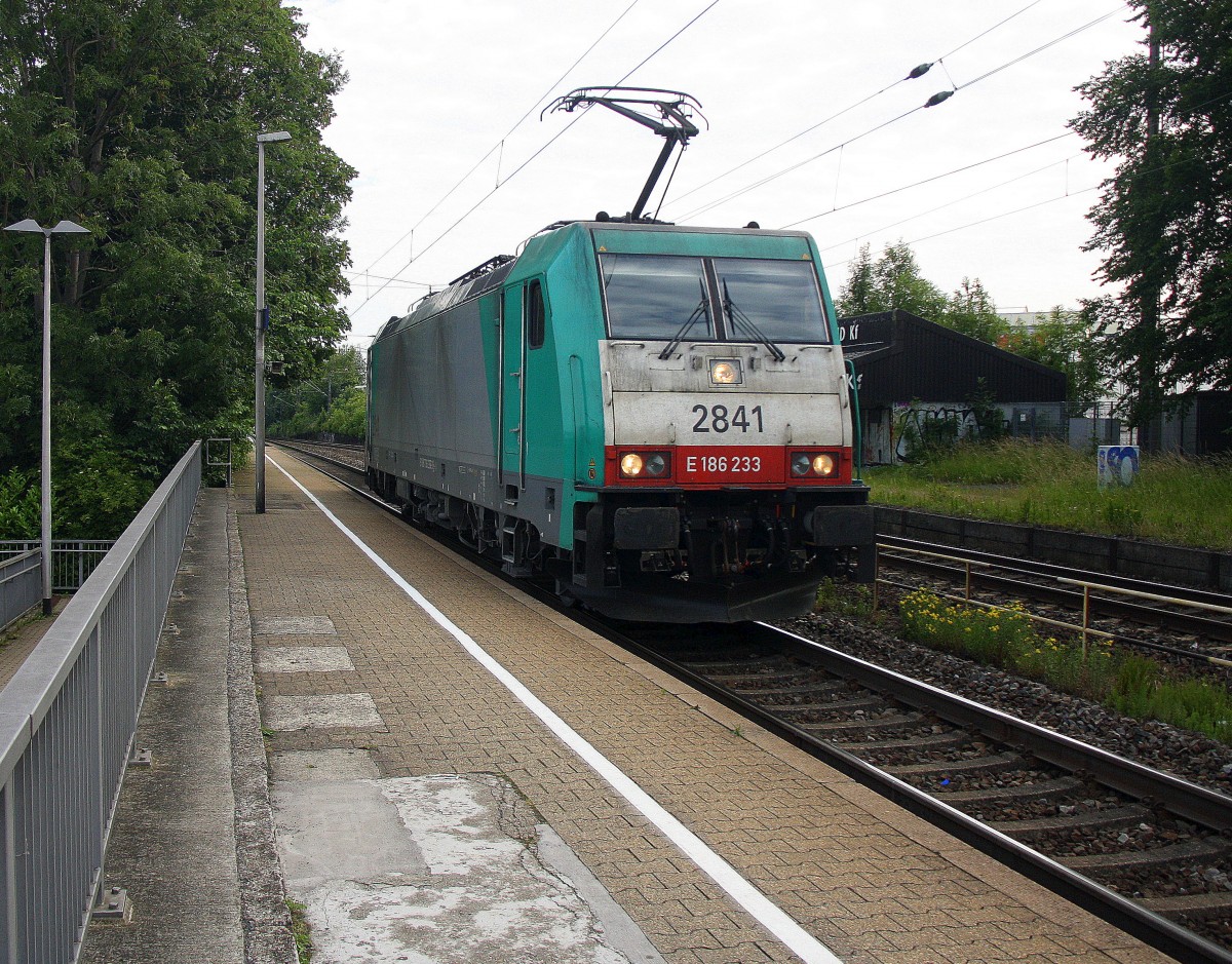 Die Cobra 2841 kommt als Lokzug die Kohlscheider-Rampe hoch aus Richtung Neuss und fährt in Richtung Aachen-West und fährt durch Kohlscheid in Richtung Richterich,Laurensberg,Aachen-West. An einem schönem Sommermorgen vom 25.6.2015.